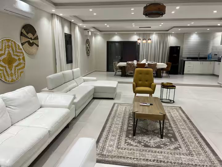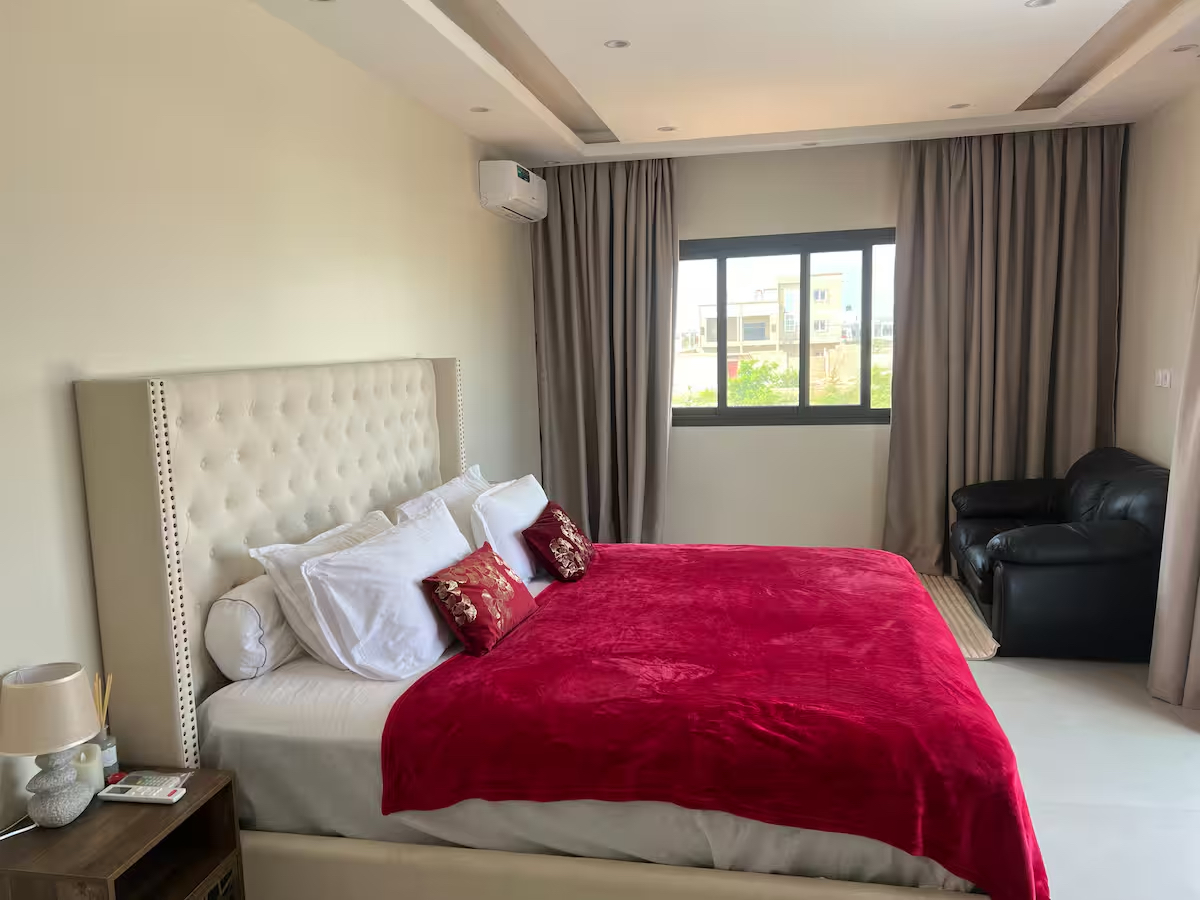 Séjournez dans cette sublime Villa Prestige Somone, villa cosy de luxe et de prestige, la villa comprend 3 grandes chambres, salon, salle de bains avec douches, piscine, mini jardin.